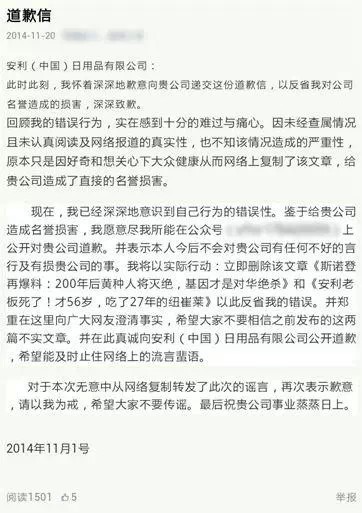 在道歉信中,被告均就其造谣行为向公司表达了歉意,同时呼吁公众诚实守信,不要造谣传谣。首起诉讼案的被告表示“我怀着深深地歉意向贵公司递交这份道歉信,以反省我对公司名誉造成的损害,深深致歉。”同时也呼吁广大网友“请以我为戒,希望大家不要传谣。”