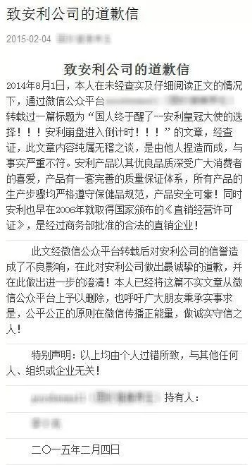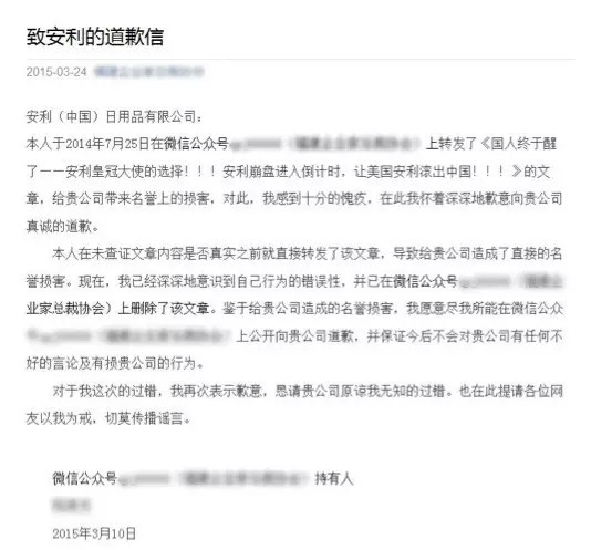 一段时间以来,不断有人借助网络渠道,散布针对安利公司的谣言。针对泛滥的网络谣言,公司一方面多次公开辟谣并要求造谣传谣者停止恶意行为,一方面对置若罔闻的造谣传谣者先后发起四例诉讼,全部胜诉。公司同时商请腾讯对传谣微信公众号进行封号处理,迄今封号超过100个,有效震慑造谣传谣者。